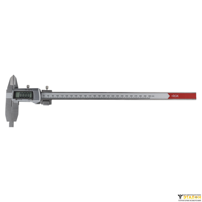 Электронный штангенциркуль RGK SC-II-300, идентичный по конструкции и функциональным возможностям изделию ШЦЦ-II-300-0,01 по ГОСТ 166, обеспечивает измерение размеров изделий и деталей в диапазоне до 300 мм с разрешением 0,01 мм. Модель оснащена механизмом для точной установки положения рамки с микрометрической подачей и двухсторонними губками различной формы: верхняя часть снабжена кромочными, а нижняя – плоскими внутренними и цилиндрическими внешними измерительными поверхностями. Поддерживается возможность установки разметочного приспособления, доступного опционально.