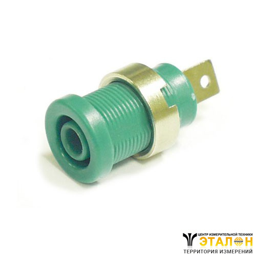 Гнездо 3266G внутренним диаметром 4 мм с двойной изоляцией с гаечным креплением и ножевым соединением (пластина 6 мм*8,5 мм с центральным отверстием). Высота пластиковой части 23 мм, внешний диаметр 12 мм. Защита по CAT 3, максимальный ток 25 А, максимальное напряжение 1000 V, контактное сопротивление не более 5 мОм. Цвет зеленый.