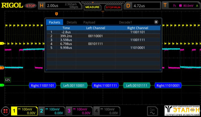 Опция DS8000-R-AUDIO добавляет в осциллографы Rigol серии DS8000-R возможность декодирования и запуска по сигналам шины I²S.