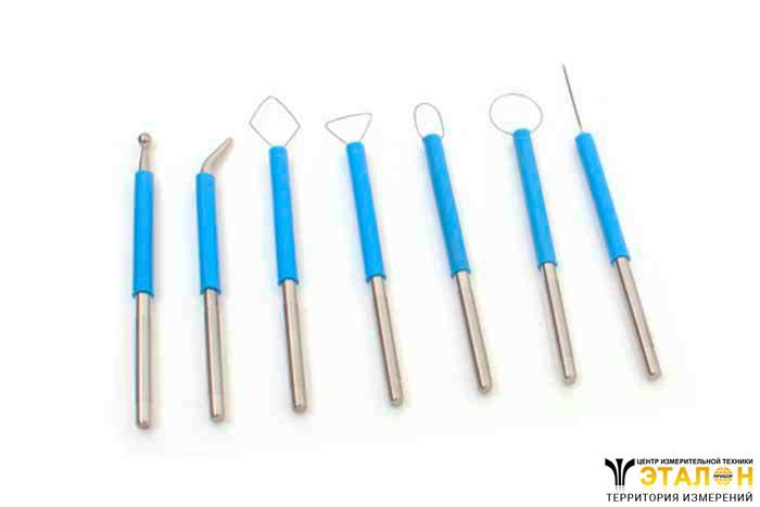 В состав комплекта входит: сферический электрод диаметр 4 мм; сферический электрод диаметр 2 мм; петля малая диаметр 6 мм вертикальная; петля овальная 5х8 мм вертикальная; петля каплевидная 12х16 мм вертикальная; игла прямая длина 10 мм; игла наклонная длина 10 мм. Длина прямой части электродов – 10 см. Толщина вольфрамовых нитей петель 0.35 мм (0.2 мм для наборов с индексом R), игл - 0.5 мм (0.35 мм для наборов с индексом R).