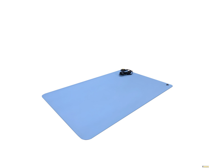 Антистатический коврик изготовлен из 2-х слойного износостойкого высококачественного каучука класса А. Данный каучук отличается отсутствием едкого запаха. Верхний слой — токорассеивающий, имеет синий или серый цвет, нижний слой — токопроводящий, черного цвета. Настольный антистатический коврик устойчив к кратковременным химическим и температурным нагрузкам и не содержит галогенов. Коврики ESD изготавливаются как стандартных типоразмеров (600х400, 900х600, 1200х600 мм), так и иного размера по согласованию с Заказчиком.