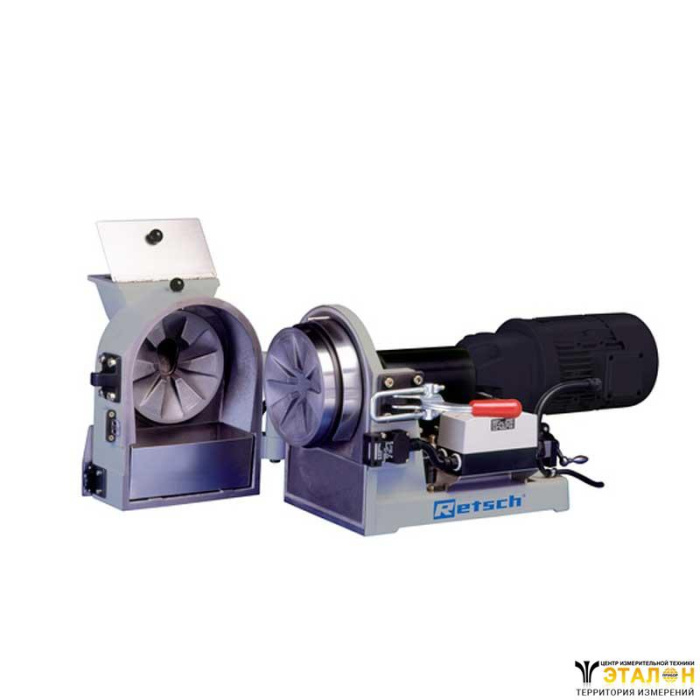 Измельченный материал просыпается из щели между дисками и собирается в приемный сосуд. Ширина щели между измельчающими дисками может устанавливаться от 0,1 до 5 мм и может быть отрегулирована непосредственно во время работы. Дополнительно специальное смотровое окно позволяет контролировать установку ширины щели.