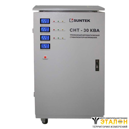 Стабилизатор трехфазный SUNTEK СНТ 30000 ВА мощностью 30 кВА используется для защиты оборудования, установленного на промышленных объектах, в частных домах, дачах, от перепадов напряжения и короткого замыкания. Стабилизатор поддерживает широкий диапазон входного напряжения и отключается только при выходе за рамки фазного 120-285 Вольт.