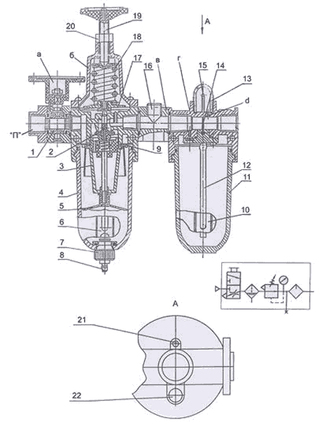 Для настройки служит винт с маховичком 19 при вращении которого изменяется сила пружины 18, воздействующая на мембрану 17 и через нее на дросселирующий клапан 2, проходное сечение которого непостоянно и зависит от внешних воздействий. Степень открытия дросселирующего клапана определяет уровень давления сжатого воздуха на входе блока кондиционирования.