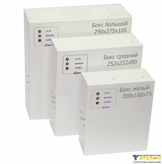 Светодиодная индикация работы блока выведена на переднюю панель. Применяются 3 варианта боксов - малый (200х168х75), средний (252х222х80), большой (290х275х105). Стандартные варианты ББП в боксе приведены в описании каждого блока.