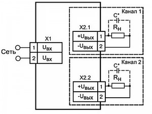 Примечание. При длине проводов между блоком и нагрузкой более 1 м и отсутствием на входе нагрузки входных конденсаторов рекомендуется параллельно нагрузке подключить керамический конденсатор емкостью не менее 0,1 мкФ и напряжением ≥1,5 Uвых применяемого блока.