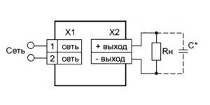 Примечание. При длине проводов между блоком и нагрузкой более 1 м и отсутствием на входе нагрузки входных конденсаторов рекомендуется параллельно нагрузке подключить керамический конденсатор емкостью не менее 0,1 мкФ и напряжением ≥1,5 Uвых применяемого блока.