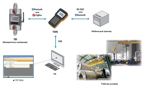 ·подключение пульта TWN по каналу USB к компьютеру с установленной программой TW-Works для приема/передачи данных взвешивания, названия и номера товара, текста заголовкаОпции
