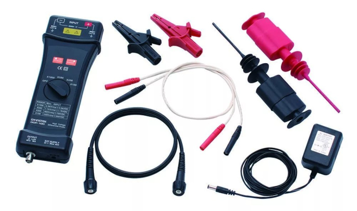 Высоковольтный диференциальный пробник. Полоса пропускания 100 МГц; коэф. ослабления х200, х500, х1000; погреш. коэф. ослабл. ±2 %; макс. Uвх. (DC+AC пик) ≤ 700 В (х100)/ ≤ 1400 В (х200)/ ≤ 3500 В (х500)/ ≤ 7000 В (х1000); вх. импеданс: 54 МОм/1,2 пФ (диф. режим), 27 МОм/2,3 пФ (между земл. и входами); вр. нараст.: < 3,5 нс (х200, х500, х1000), < 7 нс ( х100); Uвых. ≤ ± 7 В; Вых. импеданс 50 Ом; питание 9 В пост. (внешнее); потребл. мощн. 0,4 Вт (ок 35 мА макс.). Макс. диф. напряжение 6500 В скз.