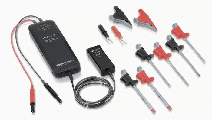 Высоковольтный дифференциальный пробник 120 МГц, 1000 Вскз между общей землей и одним из входов, 1500 Впик между дифференциальными входами, коэффициент деления 1:50 и 1:500, ProBus, 1 МОм, длина кабеля 2,25 м.