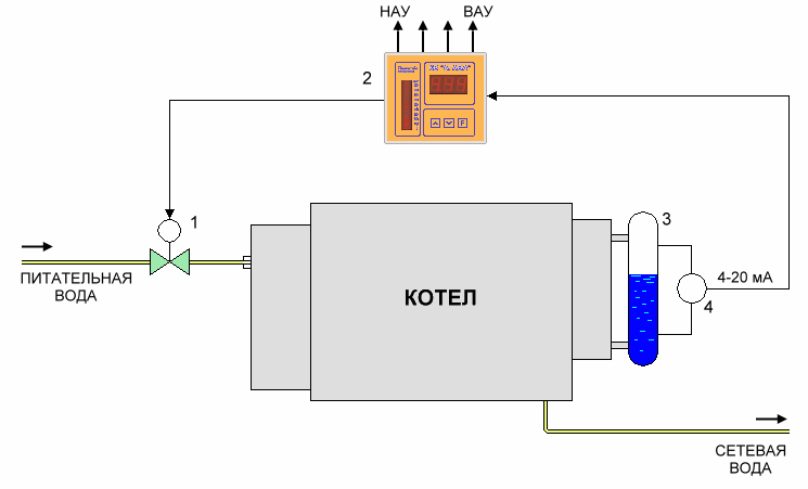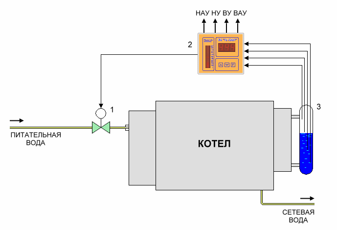 Рис. 2 Схема регулирования уровня воды в барабане котла с электродной уровнемерной колонкой