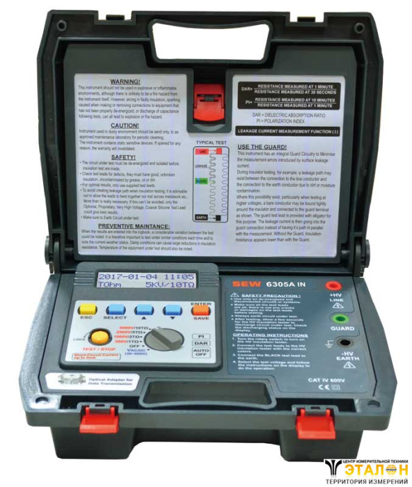 | Особенности | Измерение тока утечки в диэлектрике (0,5 нА ...0,55 мА). Звуковой и текстовый индикатор наличия опасного напряжения в тестируемой цепи. Календарь, встроенный таймер испытаний до 30 мин. | 200 ячеек памяти для хранения результатов измерений. Встроенный контейнер для укладки ЗИП | (под крышкой). |