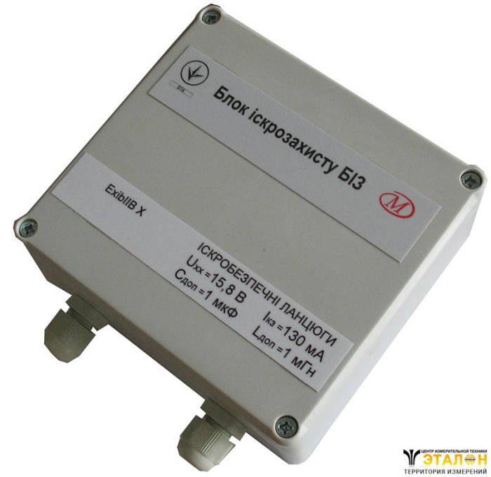 Блок устанавливается вне взрывоопасной зоны, имеет выходные искробезопасные цепи, выполненные с уровнем взрывозащиты “ib” согласно ГОСТ 22782.5-78 и имеет маркировку по взрывозащите “ExibIIB Х", искробезопасные цепи: Uxx = 15,8 В; Iк.з = 130 мА; Lдоп. = 1 мГн; Cдоп. = 1 мкФ.