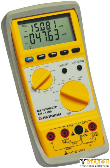 Мультиметр АКТАКОМ АМ-1109 отличается от прочих мультиметров наличием двух каналов, что позволяет производить измерения одновременно двух величин. Везде, где раньше требовалось проводить измерения каждой величины поочередно, либо где нужно было использовать два прибора – этот мультиметр облегчит вам задачу. Эта возможность полезна, в частности, при ремонте сотовых телефонов – например, можно отследить разницу между зарядом и разрядом его аккумулятора. Возможность измерения истинных среднеквадратических значений (True RMS) позволяет цифровому мультиметру АМ-1109 корректно проводить измерения искажённых и несинусоидальных сигналов. Наличие в цифровом мультиметре АМ-1109 быстродействующей графической шкалы даёт возможность наблюдать динамику изменения измеряемых величин.