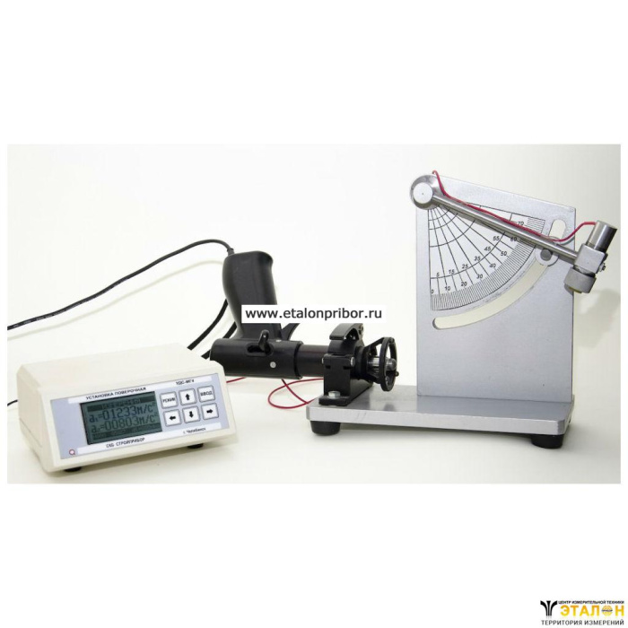Установка состоит из маятника, с закрепленным на нем измерительным преобразователем, зажима для крепления поверяемого прибора, электронного блока и оптического датчика, предусмотрена возможность начальной фиксации маятника на заданный угол.