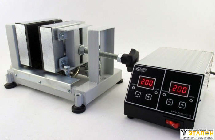 Установка содержит два вертикальных нагревателя установленных параллельно друг другу с возможностью регулирования зазора между ними. Контроль и задание температуры нагревателей осуществляется с помощью двухканального цифрового блока управления.