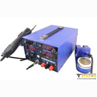 Станция используется для двухстороннего печатного монтажа. Паяльник, термофен и источник питания управляются независимо двухядерным микроконтроллером, это означает, что они могут работать независимо друг от друга. Цепи паяльника и термофена содержат датчики температуры с обратной связью, соединенные с микроконтроллером управления температурой и LED дисплеем. Детали станции имеют устройства самодиагностики и интеллектуальной контроль над перегревом, коротким замыканием, обрывом в цепи, перегрузкой и т.д. LED дисплей показывает неисправность и тип защиты. Когда паяльник не используется более 10 минут - он переходит в режим TEMP: его температура падает до 200°C, на дисплее отображается "SLP" - это позволяет продлить срок службы и экономить электроэнергию.