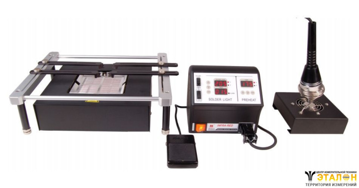 • Подогреватель инфракрасный кварцевый среднего диапазона мощностью 800 Ватт (размер 120 х 120мм). Цифровой контроллер управления с установкой температур нижнего и верхнего нагревателей.. Ножная педаль для включения верхнего излучателя. Держатель платы.