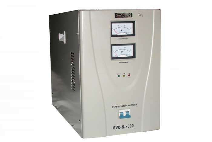 Стабилизатор напряжения SVC-N-8000 предназначен для поддержания стабильного напряжения в однофазных сетях напряжением 220В, частотой 50Гц для питания электроприборов бытового назначения.