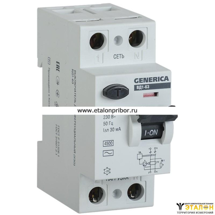 Быстродействующий защитный выключатель ВД1-63 (УЗО) GENERICA - устройство электронного типа, зависящее от напряжения и реагирующее на дифференциальный ток, без встроенной защиты от сверхтоков. Предназначен для защиты человека от поражения электрическим током.