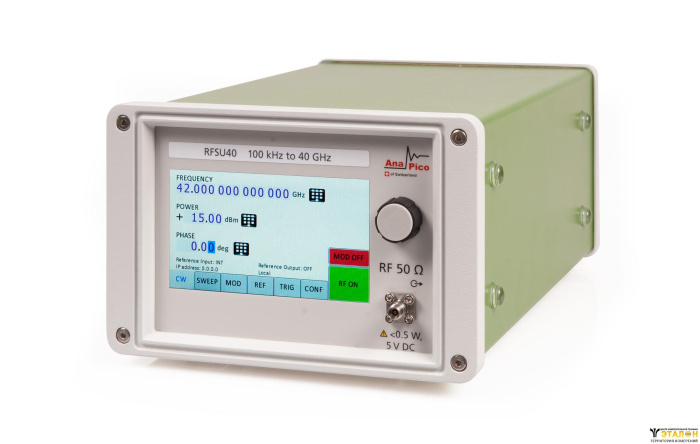 | Особенности | Высокая выходная мощность. Время установки частоты/амплитуды 200 мкс (20 мкс с опцией FS). Фазовый шум < -145 дБн/Гц (отстройка на 20 кГц от несущей 1 ГГц). работа от внешнего аккумулятора. Серия аналоговых генераторов RFSU обеспечивает аналоговое и цифровое свипирование, включая свипирование по списку, что позволяет устанавливать частоту, мощность и время выдержки индивидуально |