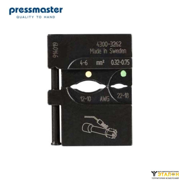 Матрица Pressmaster 4300-3262 - для опрессовки соединительных трубок с термоусадкой на провод 0.32 - 6 мм2. Матрица для трубок имеет большую ширину по сравнению с матрицей для обжима наконечников.