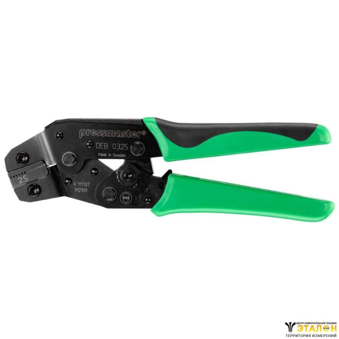 Pressmaster DEB-0325 - кримпер для обжима втулочных кабельных наконечников на провод 0.25 - 2.5 мм² (AWG 24-14) согласно стандарта DIN 46228. Подача наконечника с торцевой стороны кримпера.