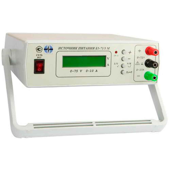 Б5-71/3М - Источники питания постоянного тока выполнены в виде переносного моноблока со съемным сетевым шнуром питания сетевым. На передней панели расположены цифровой индикатор текущих и установленных значений тока и напряжения, индикатор режима стабилизации тока, кнопки управления, гнезда выходного напряжения. На задней панели находится разъем для подключения шнура питания сетевого.