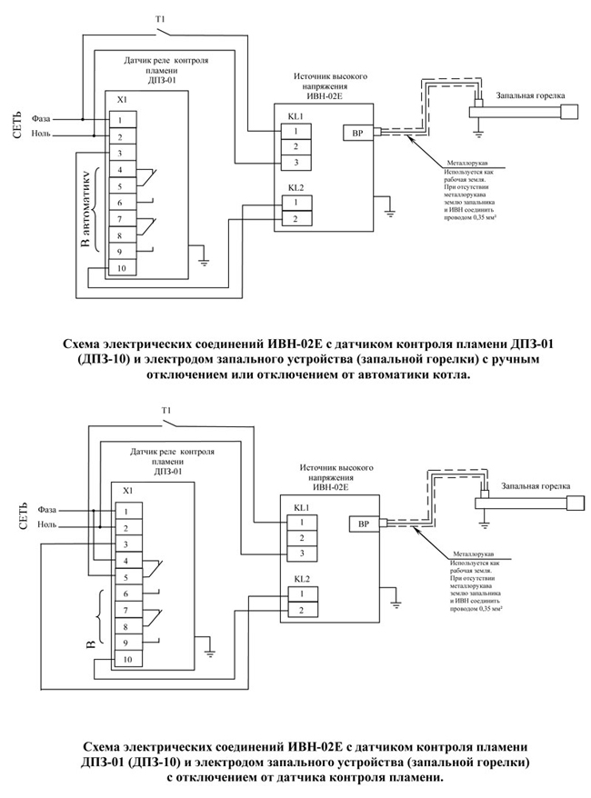 НАЗНАЧЕНИЕ: Источник высокого напряжения ИВН-02Е предназначен для создания высоковольтных искровых разрядов при поджиге горючей смеси в газовых и жидкотопливных горелочных устройствах.