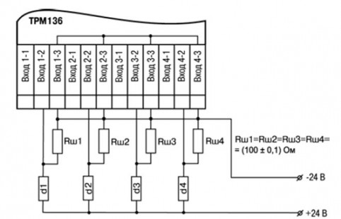 Пример схемы подключения активных датчиков d1-d4 с выходным сигналом тока от 4 до 20 мА