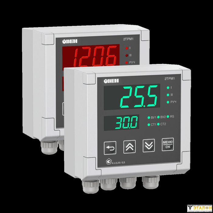 2ТРМ1 – двухканальный цифровой терморегулятор, предназначенный для измерения, регистрации или автоматического регулирования температуры, а также других физических величин (давление, влажность, уровень, расход и т.д.). Отличительной особенностью прибора является наличие двух независимых каналов управления. Прибор осуществляет как независимое управление по двум каналам, так и совместную работу каналов в задачах регулирования и сигнализации. Наличие второго входа позволяет выполнять регулирование по двум величинам с вычислением среднего значения или разницы показаний входов. Двухканальный терморегулятор 2ТРМ1 работает с разными типами датчиков что позволяет одним прибором контролировать две физические величины, например температуру и давление, температуру и влажность, давление и уровень. Наличие RS-485 позволяет выводить все измеряемые и настраиваемые параметры прибора в сеть диспетчеризации предприятия.