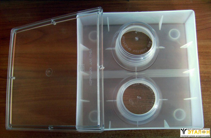 Изготовлена из пластмассы. Состоит из корпуса, двух стаканов и крышки. Легко разбирается, моется, дезинфицируется.