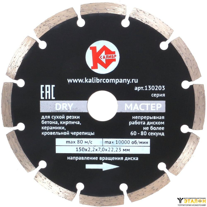 Диск алмазный "Калибр-Dry" 150х22мм (арт.130103) предназначен для машин шлифовальных угловых.