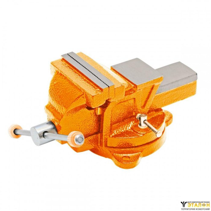 Массивный чугунный корпус и основание покрыты краской, защищающей тиски от коррозии, что увеличивает их рабочий ресурс. Сменные зажимные губки выполнены из закалённой стали высокого качества. Корпус, с возможностью поворота на 360° относительно основания, способствует удобной обработке заготовки. Наличие наковальни расширяет функциональные возможности слесарных тисков. Предусмотрено крепление основания к верстаку (рабочему столу) 3-я болтами.
