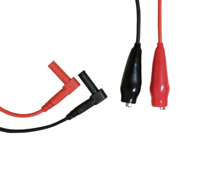 Комплект состоит из красного и черного проводов, с изоляцией из ПВХ, с одной стороны зажимы типа "Крокодил" (захват до 8 мм), с другой - угловые укрытые в корпус однополюсные штепсели (типа "банан") с заглушками.