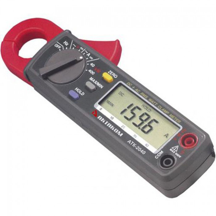 Токовые клещи-ваттметр АТК-2040: измерение постоянного (0,1 ... 400 А) и переменного (40 Гц ... 1 кГц) (0,1 ... 400 А) тока, постоянного и переменного (40 Гц ... 1 кГц) напряжения (0,1 ... 400 В), постоянной (0,01 ... 400 кВт) и переменной (0,01 ... 200 кВт) мощности, частоты (0,01 Гц ... 1000 кГц). True RMS. Фиксация min/max/hold. Диаметр захвата 23 мм. Базовая погрешность 1,5%. Графическая шкала. Питание 2х1,5 В. Поставляется в кейсе. Габариты 183х61,3х35,6 мм. Вес 190 г.
