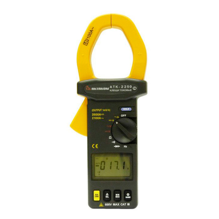 Токовые клещи АТК-2250: измерение постоянного тока (0,1 ... 2500 А), переменного (40 ... 400 Гц) тока (0,1 ... 2100 А), постоянного (0,1 мВ ... 600 В) и переменного напряжения (0,1 мВ ... 600 В), частоты (100 Гц ... 1 МГц), сопротивления (0,1 Ом ... 40 МОм). Фиксация значений, диаметр до 55 мм. Двойной ЖКИ. Габариты 271х112х46 мм. Вес 647 г.