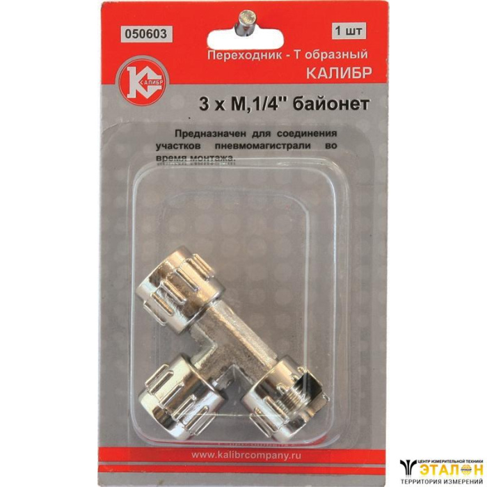 Переходник Калибр T-образный 3xМ 1/4" байонет. Предназначен для соединения и разветвления участков пневмомагистрали во время монтажа.