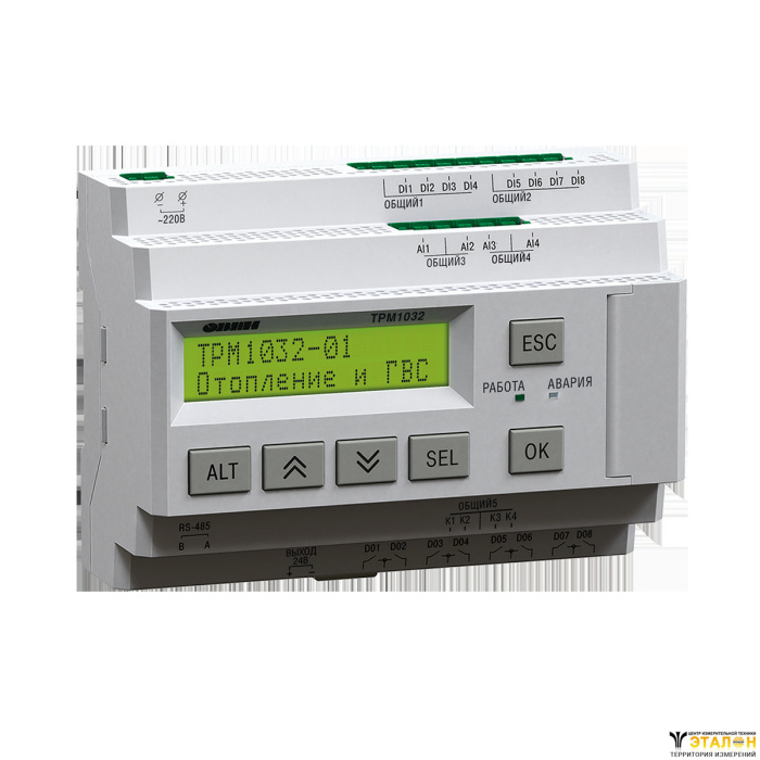 ТРМ1032 - контроллер с готовым алгоритмом регулирования температуры в системах отопления и ГВС. Предназначен для применения в индивидуальных и центральных тепловых пунктах (ИТП и ЦТП) и котельных. Регулятор отопления и ГВС поддерживает температуру по заданной уставке или отопительному графику, управляет запорно-регулирующим клапаном (КЗР), циркуляционными насосами, поддерживает давление системы, управляя контуром подпитки.