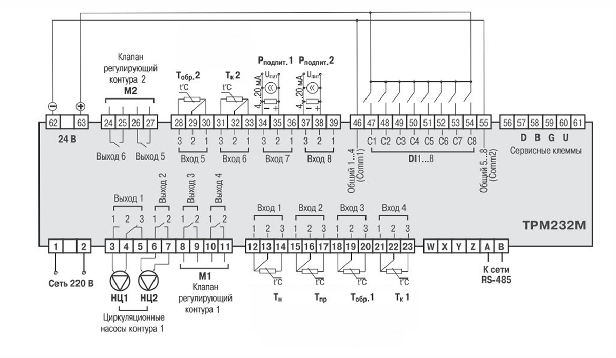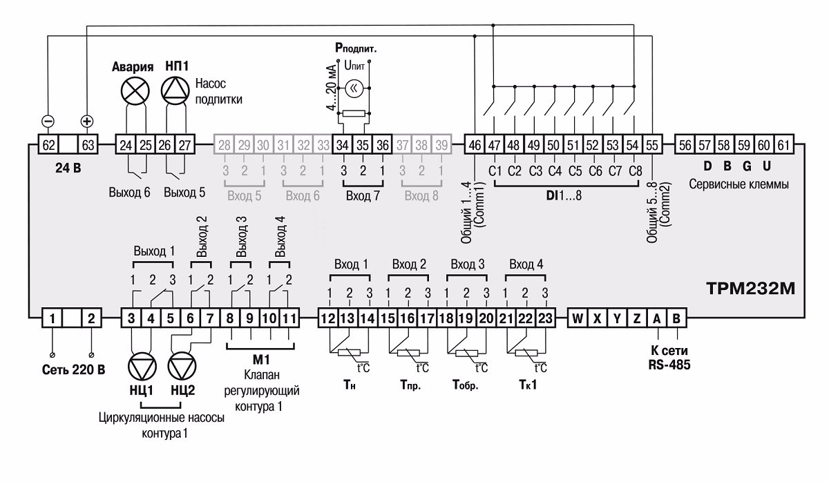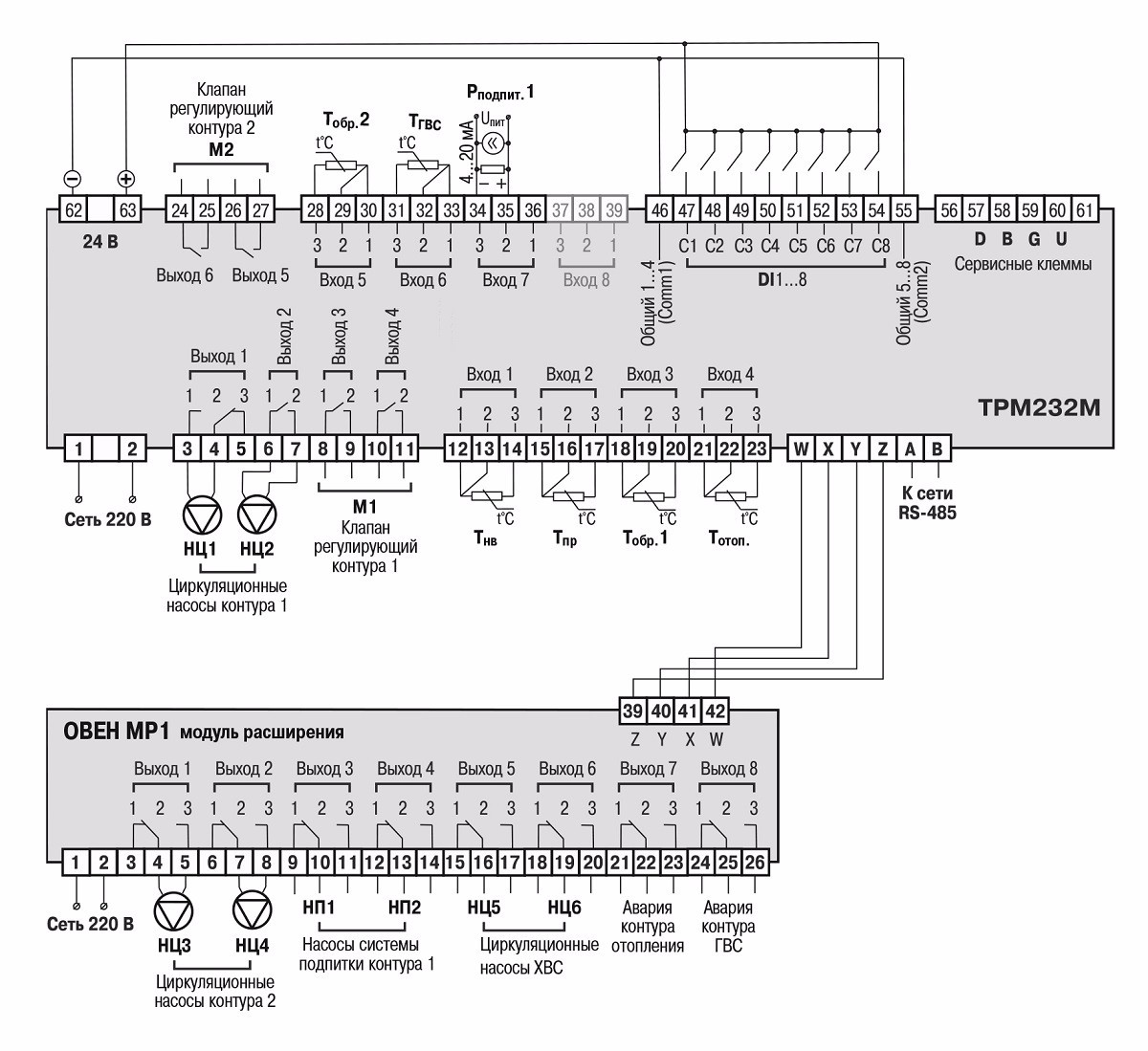 ОВЕН ТРМ232М – контроллер для регулирования температуры в системах отопления, ГВС и управления насосными группами. Предназначен для управления ИТП и ЦТП жилых и производственных зданий. В комплекте с датчиками и исполнительными механизмами ОВЕН ТРМ232М обеспечивает контроль и регулирование температуры и давления, управляет циркуляционными насосами контуров, насосами ХВС и контуров подпитки.