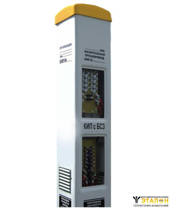 КИП ПВЕК с БСЗ - пластиковая стойка (треугольник со стороной 180 ± 10 мм - вариант исполнения 1 или квадрат со стороной 200 ± 10 мм -вариант исполнения 2) с информационным маркировкой и контрольный щиток с контактными зажимами и клеммами для измерения параметров ЭХЗ и блоком совместного защиты.