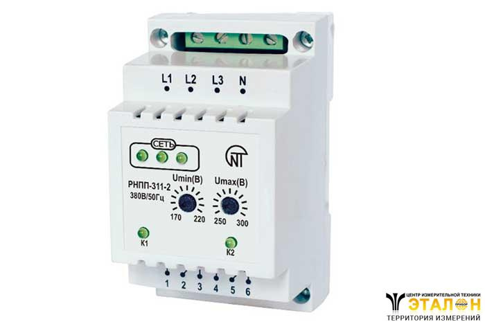 Реле РНПП-311-2 через входные контакты ( L 1, L 2, L 3, N ) включается параллельно нагрузке. Имеет два независимых выхода: выход по полнофазному пропаданию фаз (канал 1) – группа перекидных контактов 1 - 2 - 3, и выход по неполнофазному пропаданию фаз (канал 2) – группа перекидных контактов 4 - 5 - 6 . В «холодном» состоянии (реле без напряжения, не подключено) контакты 2 - 3 (5 - 6) замкнуты , а контакты 1 - 2 (4 - 5) разомкнуты . После подачи напряжения на реле загораются светодиоды «Сеть». Если напряжение нормальное, т.е., не выходит за выставленные пороги срабатывания и полнофазное – через 10 с меняют положение выходные контакты обоих каналов, т.е. замыкаются контакты 1 - 2 (горит зеленый светодиод выхода канала 1) и 4 - 5 (горит зеленый светодиод выхода канала 2) , контакты 2 - 3 и 5 - 6 размыкаются. Далее реле РНПП-311-2 постоянно контролирует напряжение по величине и полнофазности.
