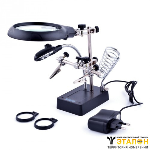 Держатель плат "третья рука" с лупой 2,5х/7,5х/10х, подставка под паяльник, LED подсветка.