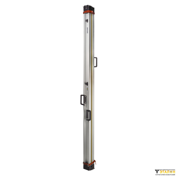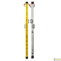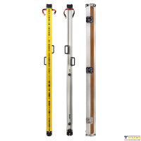 Входящие в комплект две неразъемные инварные рейки из алюминиевого профиля стандартно оснащены двумя круглыми уровнями, которые закреплены на разной высоте, и складывающимися ручками. Инварная вставка удерживается продольными элементами в соответствующем пазе лицевой части корпуса и пружиной, компенсирующей растяжение профиля. Пятки реек с износостойкой опорной пластиной, изготовленной из никелированной стали, снабжены специальными выступами, исключающими контакт лицевой части двух изделий при их укладке в транспортировочный бокс. Для их крепления между собой предусмотрены кожаные ременные стяжки, закрепленные в верхней части обоих инструментов.