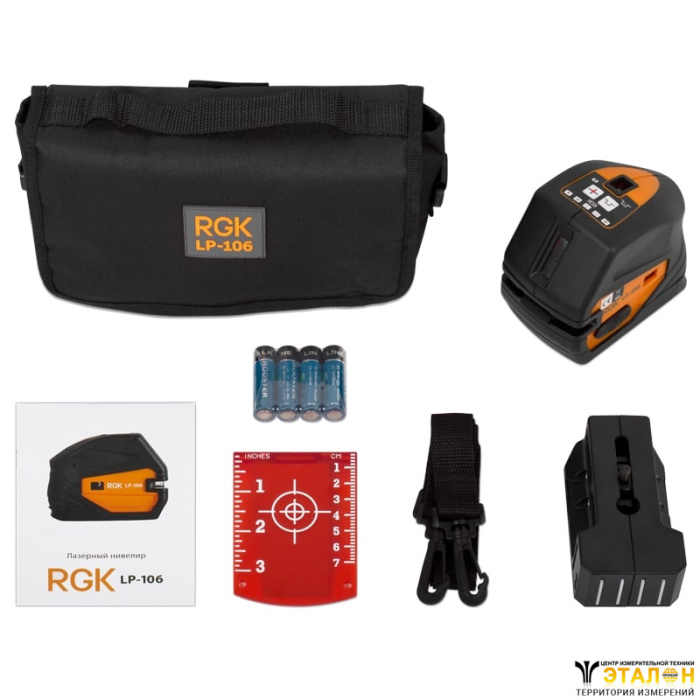 Комплект поставки: лазерный уровень LP106, поясная сумка, кронштейн, батарейки.
