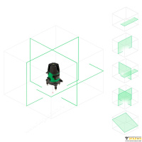 Лазерный нивелир RGK LP-64G проецирует 5 лучей: 4 вертикальных с углом развертки 120° и 1 горизонтальный – 110°. Проецируемые лучи формируют 2 перекрестия, один перед прибором, другой непосредственно над ним. В сочетании с лазерным отвесом это позволяет осуществлять перенос разметки с пола на потолок. Также благодаря отвесу вы можете установить прибор точно над заданной точкой.