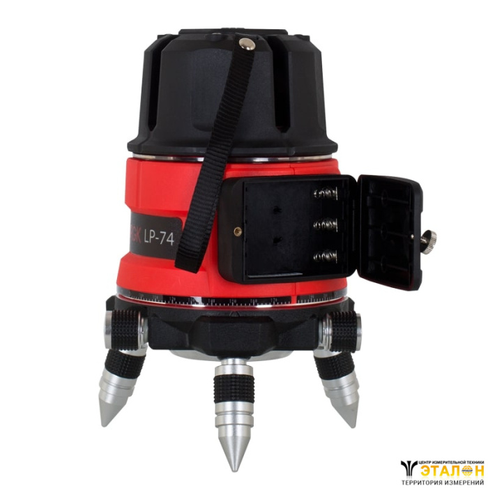 Лазерный уровень RGK LP-74 оснащен лазерным излучателем красного цвета. Точечные указатели на отображаемых плоскостях показывают середину плоскости для удобной разметки поверхностей.