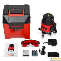 Лазерный уровень RGK LP-74 с красным лучом, 4 вертикальными плоскостями и встроенным аккумулятором предназначен для комфортной работы как в помещении, так и на улице с использованием приемника.