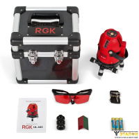 Корпус RGK UL-443 выполнен из качественных материалов и обеспечивает надёжную защиту прибора от строительной пыли и влажности. Питание прибора осуществляется от стандартных батареек типа АА. Прибор поставляется в ударопрочном кейсе.