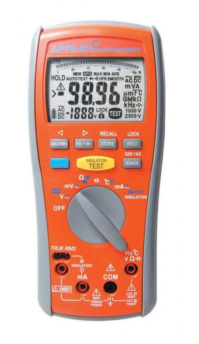Цифровой тестер изоляции с функцией RMS мультиметра: измерение сопротивления изоляции 1 кОм… 22 ГОм (±1,5 %; U испыт. 50/100/250/500/1000 В), пост./ перем. напряжения (0,1 мВ…1000 мВ/ 0,1В…1000 В), базовая погрешность ± 0,08% (DCV); силы пост./ перем. тока (0,1 мА…400 мА), частоты 0,1 Гц…100 кГц, емкости 4…4 мФ (1пФ), сопротивления 1…40 МОм (0,1 Ом) и целостности цепи, температуры -200… 1200° С, испытание p-n переходов; регистрация Min/ Max/AVG значений; автоустановка 0″ показаний (до 5 Ом), блокировка кн. управления, память (запись/вывод), ЖК-индикатор (10000), 2 области индикации, подсветка дисплея, графическая шкала (48 сегментов), зонд-пробник ДУ, автоудержание результата, авторазряд накопительного конденсатора, питание 1,5 В×4 (тип АА), автовыключение, 96×200×51 мм, масса 0,6 кг